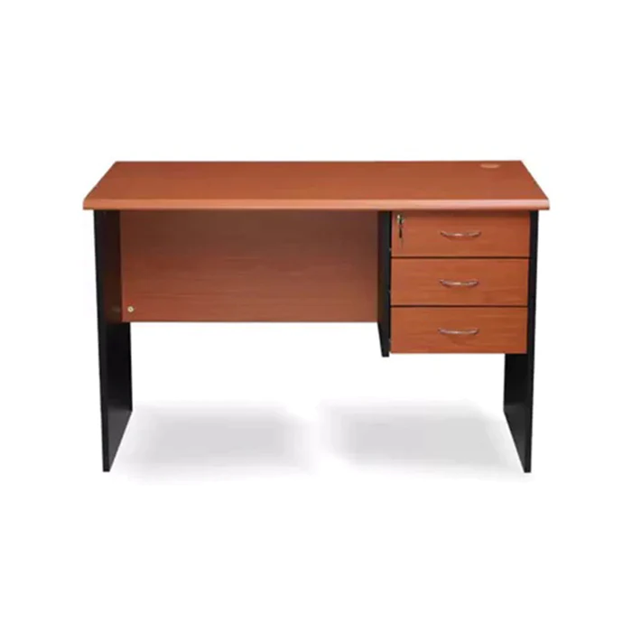 Integrated seamlessly into the desk design is a three-drawer pedestal located on one side. This provides built-in storage for your office essentials, keeping your desktop neat and organized. The top drawer is equipped with a lock, offering a secure place to store confidential files, personal items, or valuables, providing peace of mind. The drawers feature smooth metal runners for easy operation.