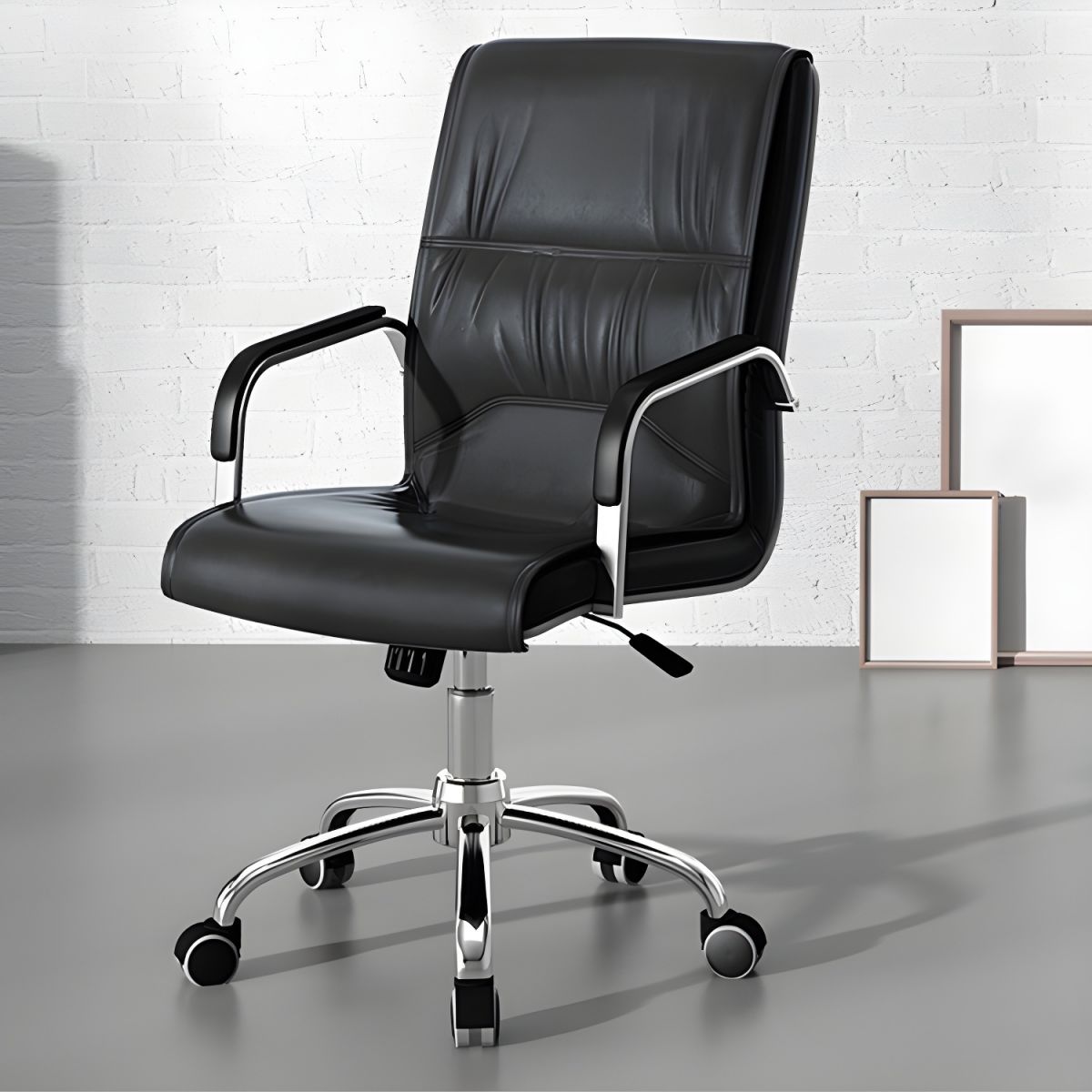 Discover unmatched comfort and ergonomic design with this premium office chair. Mid-Back Leather Office Chair – Comfort and Style for the Modern Workspace The Mid-Back Leather Office Chair is designed to deliver both luxury and functionality. Key Features: Premium Leather Upholstery: Soft and durable leather provides a luxurious feel. Ergonomic Design: Offers lumbar support to promote proper posture during long work hours. Adjustable Features: Customize your seating with adjustable height and tilt mechanisms. Sturdy Construction: Built with high-quality materials for lasting durability. Benefits: Enhanced Comfort: Ideal for long workdays, reducing back strain and fatigue. Sophisticated Look: Elevates the aesthetics of any office environment. This chair is ideal for professionals seeking a blend of elegance and ergonomic support in their office seating.
